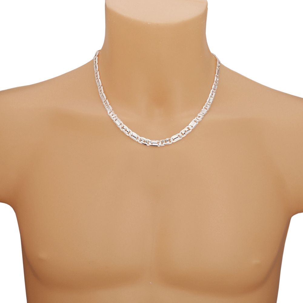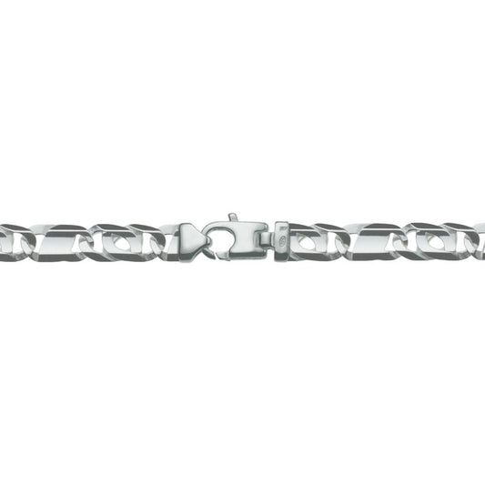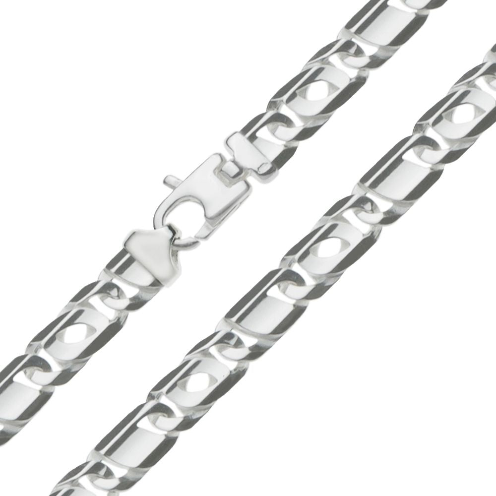 Massieve valkenoog ketting, 7 mm breed, met sterke karabijnhaak als slot. Deze valkenoog ketting is gemaakt van eerste gehalte zilver (925/1000) en is voorzien van bijbehorend wettelijk verplicht zilverkeurmerk. Deze schakelketting wordt ook wel arendsoog ketting genoemd en bestaat uit massieve schakels die zeer plat van vorm zijn. Schakels met de zogenaamde valkenoog-vorm worden afgewisseld met gladde, dichte schakels. De ketting is nikkelvrij en niet gerhodineerd.